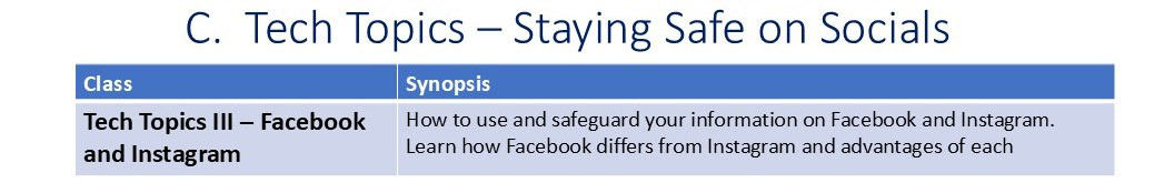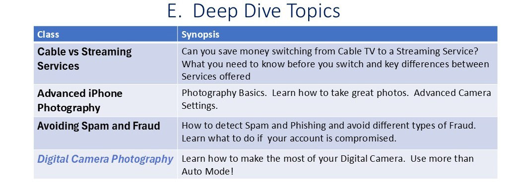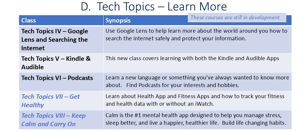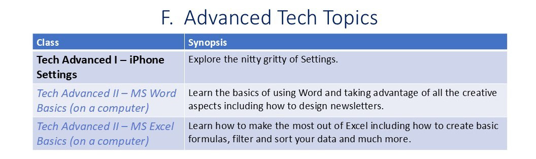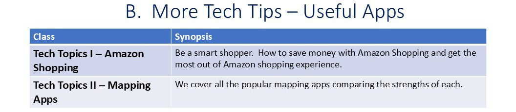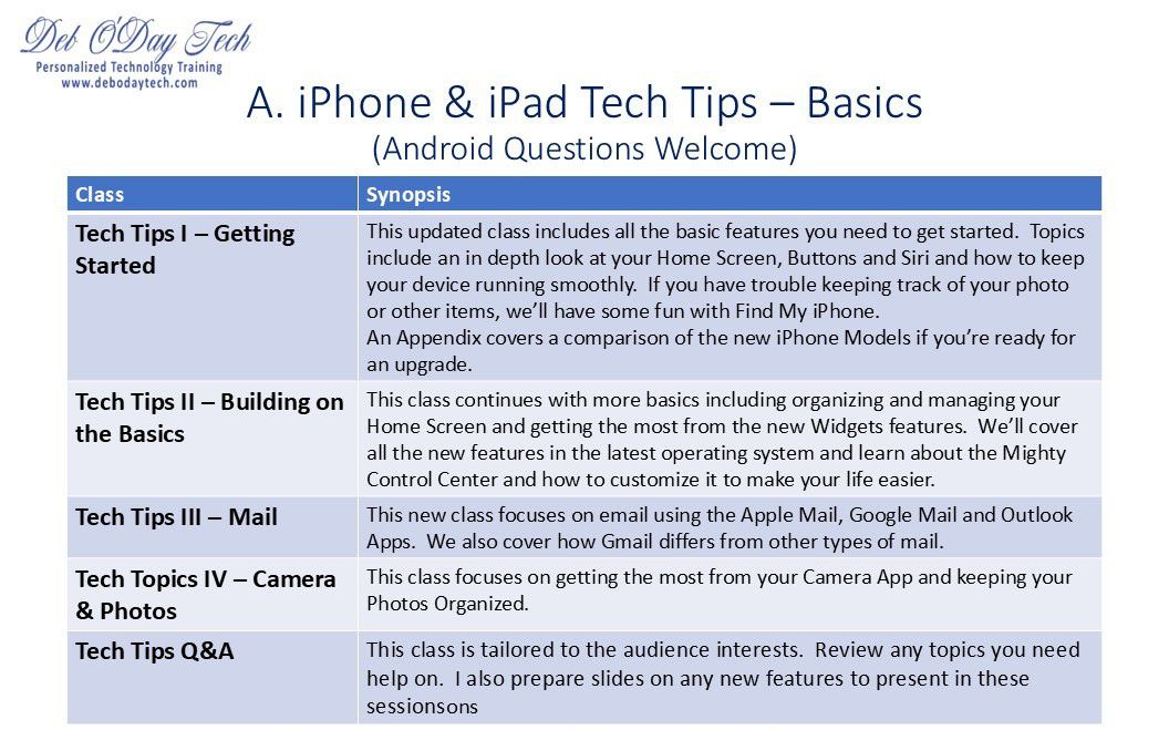 Note: The A. Tips and Tricks Basics Classes below are focused on iPhone and iPad, but many topics are similar to Android phones and questions are always welcome.